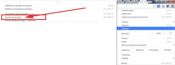 Тиснемо на кнопочку меню у вигляді трьох смужок в правому верхньому кутку і з випав списку вибираємо пункт «Закладки – Диспетчер закладок»: