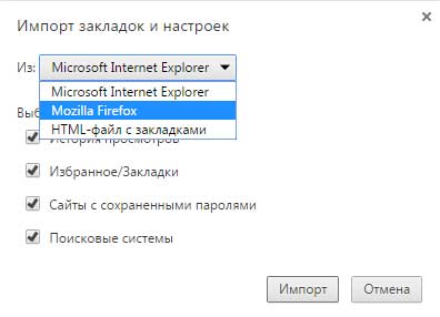 Тут у нас відкривається віконце, в якому ми одразу ж можемо імпортувати закладки з браузерів Internet Explorer або Mozilla Firefox або ж вибрати файл з закладками. Після того, як визначитеся з вибором, не забудьте натиснути на кнопочку «Імпорт»: