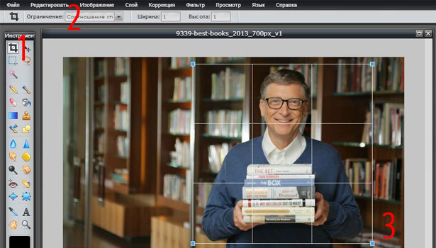 Крок 2. За замовчуванням буде натиснуто властивість “Crop Tool”, якщо воно з якихось причин не використовується, натисніть на нього, воно знаходиться зліва вгорі (цифра 1). Далі потрібно вибрати Обмеження -> Співвідношення сторін (цифра 2), якщо ви не зміните цей пункт, створити квадратну фотографію буде дуже складно. Залишилося вибрати частину квадратного зображення (цифра 3).