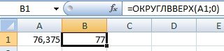 На малюнку добре видно, як сталося округлення у більшу сторону. Отже, інформацію в комірці А1 можна міняти як і в усіх інших випадках, тому що вона є змінною, і використовується в якості аргументу. Але якщо вам необхідно округлити число не більшу, а меншу сторону, то ця формула не допоможе вам. В даному випадку вам необхідна формула ROUNDDOWN. Округлення відбудеться до найближчого цілого числа, яке менше нинішнього дробового значення. Тобто, якщо в прикладі на картинці поставити замість формули ОКРУГЛВВЕРХ формулу ROUNDDOWN, то результат буде вже не 77, а 76.