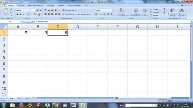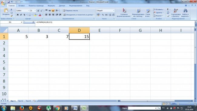 У минулому прикладі розглянуто приклад суми двох чисел, з чим впорається кожен і без допомоги Excel, але коли треба порахувати суму більш, ніж 2 значення, то це займе більше часу, тому можна виконати суму відразу трьох клітинок, для цього просто потрібно написати наступну формулу в комірку D1: