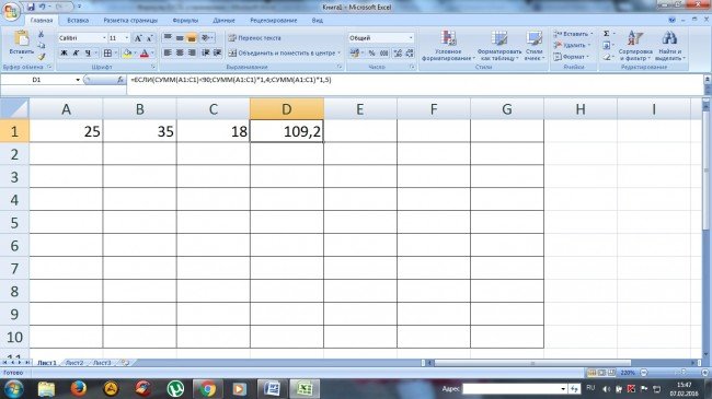 =ЕСЛИ(СУММ(А1:С1)<90;СУМ(А1:С1)*1,4;СУМ(А1:С1)*1,5).