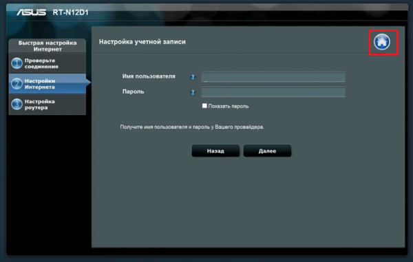 Коли ви входите в панель управління роутера ASUS, то перед вами вискакує спеціальне віконце, призначене для того, щоб швидко забити потрібні налаштування для працездатності інтернету. Зараз, нас цей пункт не цікавить, тому слід натиснути на іконку у вигляді будиночка, щоб переміститися на головну сторінку нашого меню.
