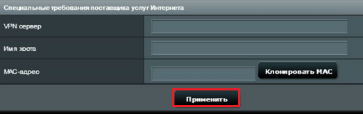 Наступний розділ «Спеціальні вимоги постачальника». Тут необхідно прописати VPN сервіс, ім’я хоста, а також MAC-адресу, і після всього цього натискаємо на кнопку «Застосувати», вона розташовується внизу цієї сторінки з налаштуваннями.