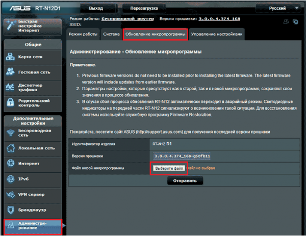 Відкривши потрібний пункт меню, ви побачите таку інформацію, як «Версія прошивки». Порівнюєте її з тією, яка вже була завантажена. Якщо ваша прошивка новіше, тоді обираєте пункт «Вибрати файл», і вказуєте розташування прошивки на комп’ютері, після цього натискаємо на кнопку «Отруїти», і бачимо, як запускається процес оновлення.