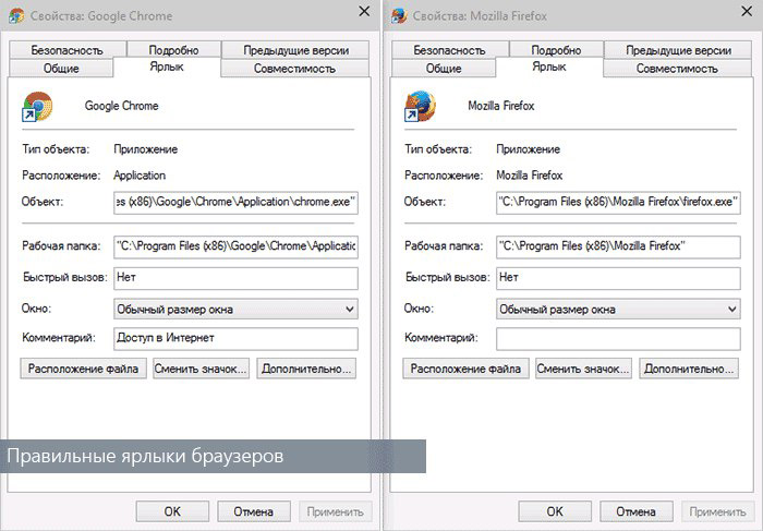 У рядку з назвою «Об’єкт» міняємо шлях до ярлика на правильний. Цю процедуру проводимо для кожного браузерного ярлика.