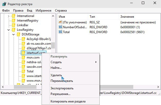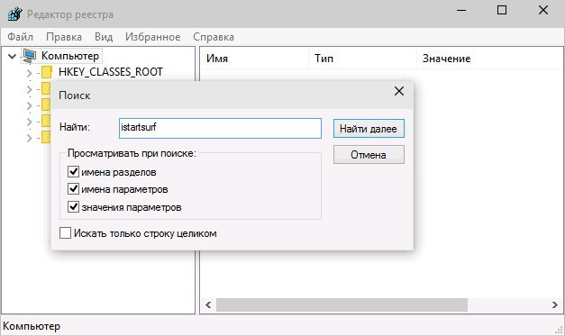 - Треба знищити все, що містить в собі слово Istartsurf (дивимося і в полі «Ім’я», і в полі «Значення»).
