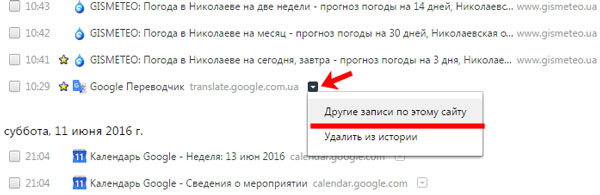 Для того щоб подивитися всі записи, збережені в історії, для певного сайту, натисніть навпроти нього на маленьку чорну стрілку та виберіть з випадаючого списку «Інші записи по цьому сайту».