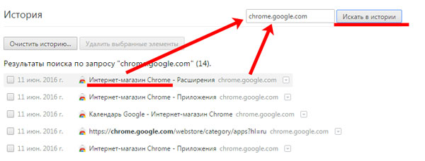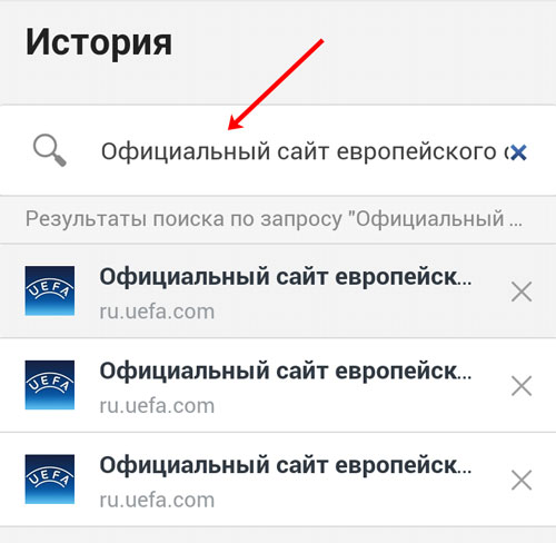 Скопійовані адреса і текст вставити в рядок пошуку, розташовану вгорі, і натисніть значок лупи. В результаті, у списку історії залишаться тільки потрібні вам сайти.