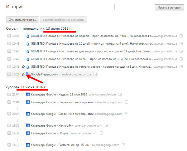 Записи відвіданих сайтів розташовуються від нових до старих і розділені по днях.