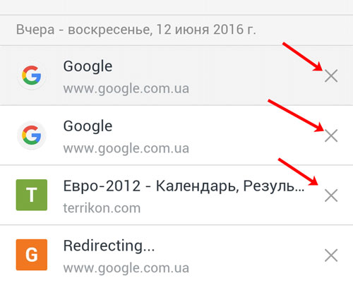 Щоб видалити деякі сайти з історії, натисніть навпроти них на хрестик. Докладно про те, як очистити історію повністю, можна прочитати в статті, перейшовши за посиланням, яка була наведена раніше.