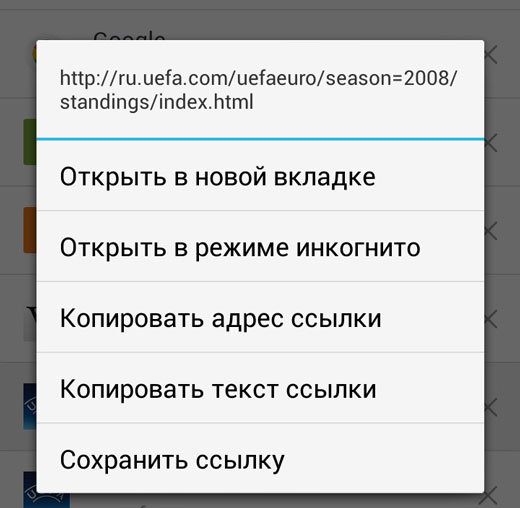 Натиснувши пальцем по обраному сайту, можна відкрити його в новій вкладці або режимі інкогніто, також можна скопіювати адресу або текст посилання.