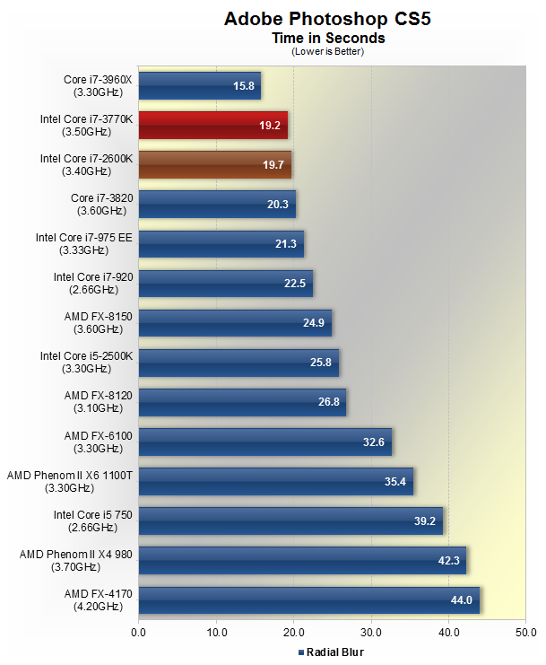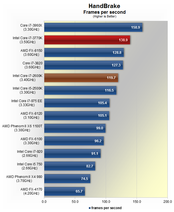 У тесті HandBrake, Core i7-3770K показав 16% перевагу в продуктивності над i7-2600K. Крім того, Core i7-3770K був швидше, ніж чіпи i7-3820 та FX-8150, хоча приблизно на 13% повільніше, ніж могутній i7-3960X.