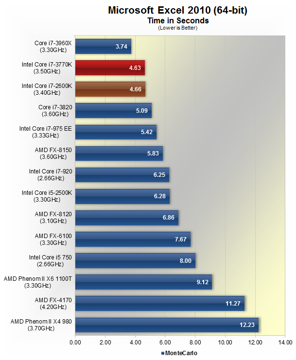 У програмі Excel 2010, новий Core i7-3770K забезпечив приблизно ту ж продуктивність, що і i7-2600K. Це означає, що він був на 9% швидше, ніж Core i7-3820, але на 24% повільніше, ніж i7-3960X.