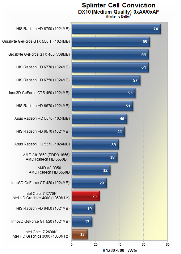 В Splinter Cell Conviction на дозволі 1280?800 наш Core i7-3770K був на 77% швидше, ніж i7-2600K. Вражаючий приріст продуктивності. Хоча, з іншого боку, Core i7-3770K все-таки був майже на 40% повільніше, ніж AMD A8-3850.