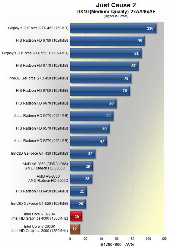 В Just Cause 2, Core i7-3770K був на 3fps швидше, ніж Core i7-2600K. У теж час, чіп AMD A8-3850 був приблизно на 48% швидше, ніж Core i7-3770K.