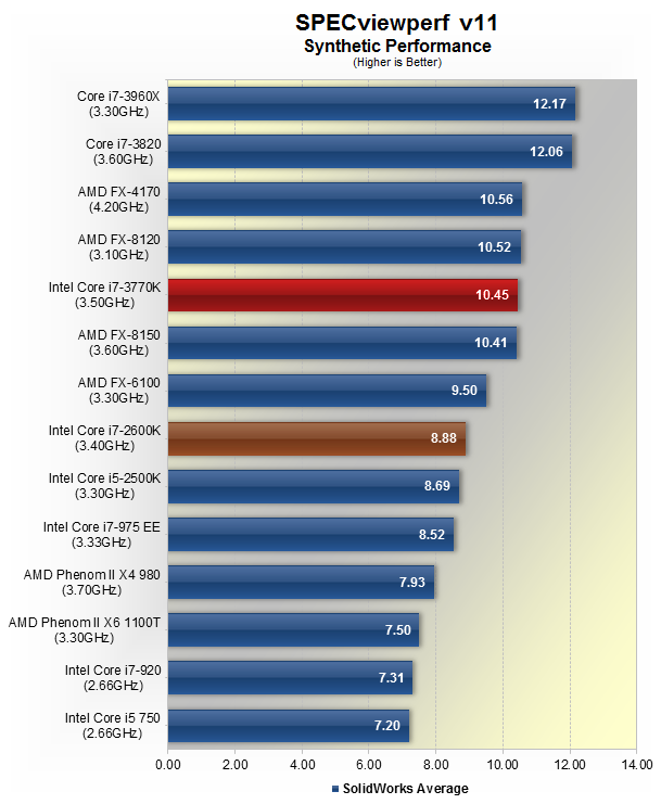У тесті SolidWorks, новий Core i7-3770K помітно спритніше, ніж i7-2600K. Різниця в продуктивності склала 18%. У теж час, Core i7-3770K видавав таку ж продуктивність, що і чіп AMD FX.