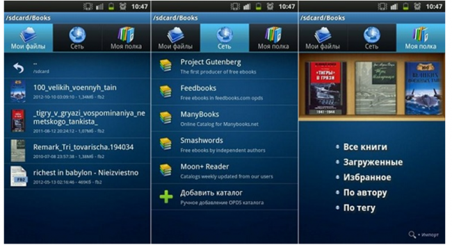 Головна сторінка цієї програми містить три вкладки, а саме: «Головна», «Моя полку», «Мережа». У першій вкладці, людина може побачити всі книги, які він колись відкривав, друга вкладка дозволяє скачувати з інтернету книги на свій пристрій, не сплачуючи за це гроші, а третій пункт, природно, буде містити всю літературу, яка колись уже була скачана з інтернету. З-за того, що сортування тут досить зручна, заблукати в просторах софта неможливо.