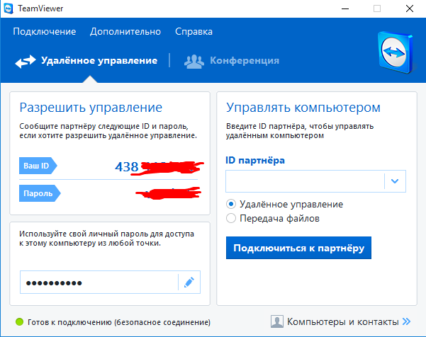 Безсумнівно, одна з найпопулярніших і функціональних програм для віддаленого доступу до комп’ютера. Програма може працювати без установки, легка і проста в освоєнні. Після запуску програма повідомить вам id вашого комп’ютера і пароль, за яким до вас може підключитися інший комп’ютер. Відповідно, ви також можете підключитися до будь-якого комп’ютера запущений TeamViewer, знаючи його id і пароль.