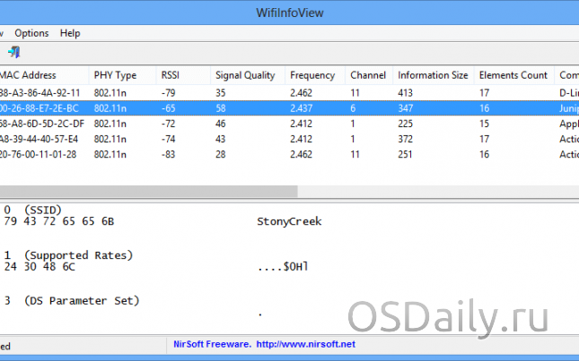 WifiInfoView сканує бездротові мережі і відображає безліч інформації про них. До неї належать ім’я мережі (SSID), MAC-адресу, тип PHY (802.11 g або 802.11 n), RSSI, якість сигналу, частота, номер каналу, максимальна швидкість, назва компанії, модель і назва маршрутизатора (якщо вони надають цю інформацію) і т. д.