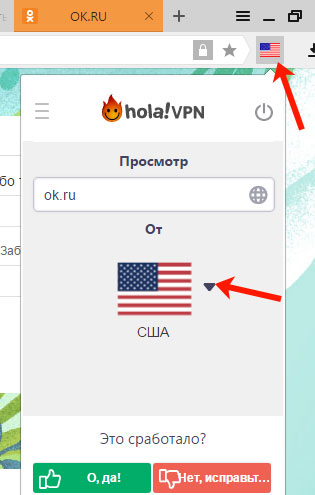 Після того, як вкажіть до якого сервера підключитися для перегляду, вибравши країну, її прапор з’явиться замість значка розширення в адресному рядку праворуч. Клікнувши на нього можна подивитися, що, наприклад, на Однокласники ми заходимо через США.
