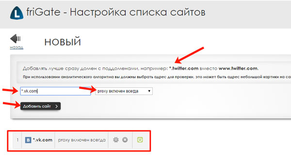 Вгорі написано, яким чином краще додавати адреси сайтів. Так, наприклад, замість «www.vk.com» потрібно ввести «*.vk.com». Введіть адресу потрібного сайту в запропоноване поле і виберіть навпроти «proxy завжди включений». Потім клікайте по кнопці «Додати сайт».
