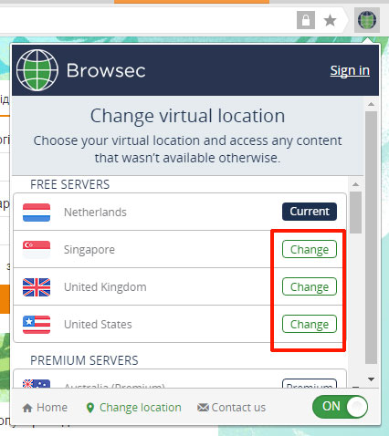 Відкриється ось такий список. У безкоштовної версії розширення, доступно тільки чотири країни. Для вибору, натисніть навпроти потрібної на кнопку «Change».