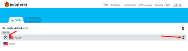 Відкриється сторінка, де буде показано, через сервер якої країни відбувається перехід за вказаною адресою. Навівши курсор мишки на рядок, можна відключити включення VPN при відкритті зазначеного сайту, натиснувши на кнопку включення до початку рядка. Якщо взагалі не хочете більше заходити на який-небудь сайт зі списку через VPN, тоді наведіть на нього курсор і натисніть наприкінці рядка на кошик.