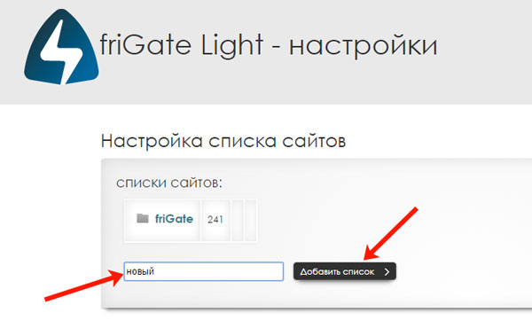 Після цього відкриється сторінка з налаштуванням списку сайтів. Тут Ви побачите папку «friGate». Зайдіть в неї і подивіться, які сайти в нього додані самими розробниками. Якщо потрібних ресурсів тут немає, тоді потрібно створити власний список і додати в нього потрібні адреси. В запропоноване поле введіть назву нового списку та натисніть кнопку «Додати список».