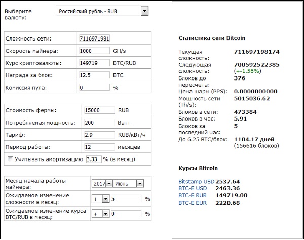 Робочий вигляд «Bitcoin Mining Calculator»