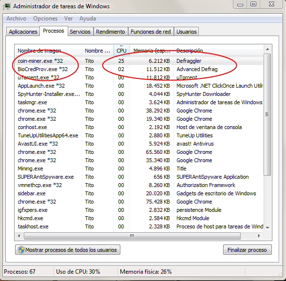 Також бувають ситуації, коли на комп’ютер випадкового користувача проникає вірусна програма-майнер, яка перетворює такий комп’ютер в станцію з видобутку біткойнів. Зазвичай в цьому випадку задіюються повна потужність комп’ютера (за що часто відповідальний процес miner.exe в Диспетчері завдань). Комп’ютер при цьому починає істотно гальмувати, глючити, а ресурсомісткі програми, що запускаються користувачем, або працюють погано або не працюють взагалі.