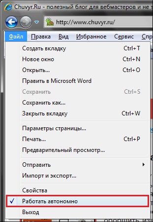 6. Змініть настроювання браузера Internet Explorer. Може здатися дивним, але деяким користувачам допоміг метод відключення автономного режиму в IE. Для цього достатньо натиснути на «Файл» (або «Сервіс») в IE, і в контекстному меню зняти галочку навпроти опції «Працювати автономно».