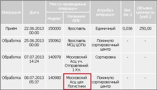 У Московському АСЦ є кілька великих цехів – сортування бандеролей та посилок, логістики та інші, через які проходить поштова кореспонденції в її транзитному шляху до одержувача. У нашому ж випадку наявність згадки про цеху логістики Московського АСЦ означає, що наша пошта пройшла обробку в логістичному цеху, після чого була відправлена на наступну транзитну щабель.