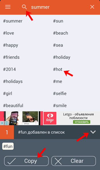 У додатку Letstag потрібно шукати теги по вибраних Вами ключовим словами. Вводите одне слово, яке відноситься до Вашого фото, відобразиться список хештегов, пов’язаних з вказаним словом і, відповідно, з Вашим зображенням.