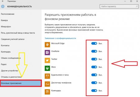 Внизу ви побачите розділ «Фонові додатки». Ось вибираємо цей розділ і з’являться кнопки, за допомогою яких ви зможете управляти включенням і вимиканням додатків.