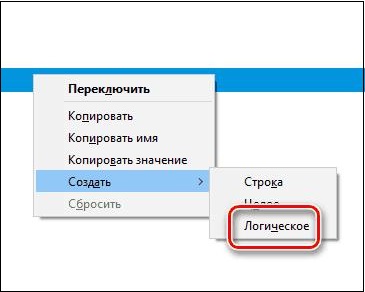 Для додавання потрібного вам параметра, наведіть курсор на порожнє місце в цьому списку, натисніть на праву клавішу миші і в меню виберіть «Створити» (New). Потім, перейшовши по стрілці, виберіть специфіку створюваного параметра («Рядок-Ціле-Логічне» — «String-Integer-Boolean»). У що з’явилася рядку введіть відповідне значення, і клацніть на «Ok»