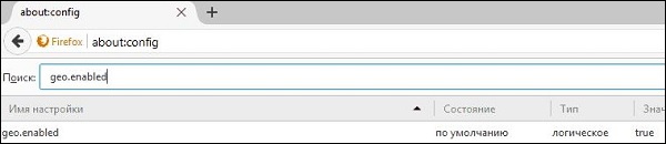 - Знайдіть параметр «geo.enabled» і встановіть йому значення «false» (відключає геолокацію);