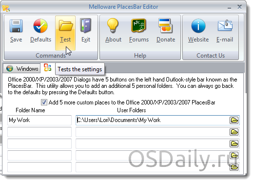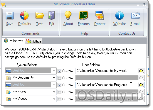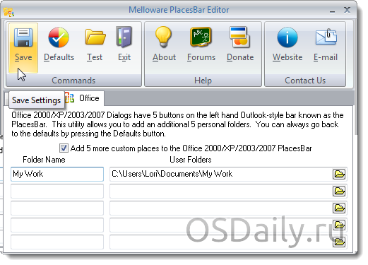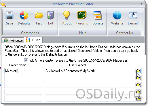 З допомогою PlacesBar Editor ви можете кастомизировать і ці діалоги. Клікніть по вкладці Office. У полі Folder Name введіть назву для кожної папки, які ви бажаєте додати. Потім за допомогою кнопки вибору папки виберіть потрібну папку або просто введіть в поле User Folders повний шлях до неї. Ви можете додати до п’яти своїх папок. Ці папки додаються в Вибране, і також відображаються як Обране в провіднику Windows.