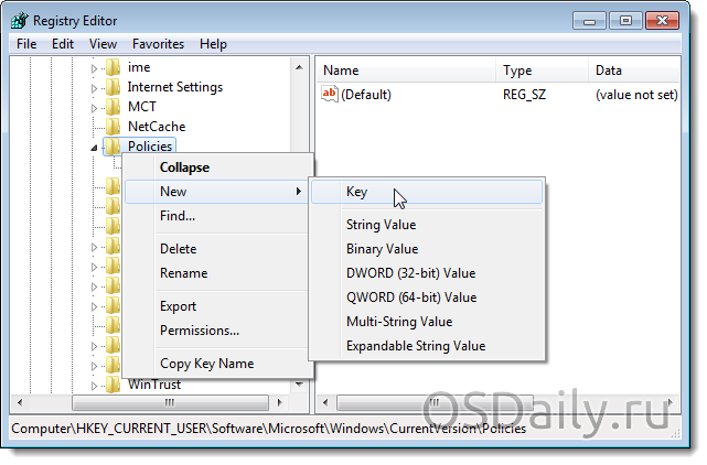 Розділи comdlg32 і Placesbar можуть і не існувати. Якщо їх немає, то вам треба їх створити. Так, наприклад, для створення розділу comdlg32 клікніть правою кнопкою миші по розділу Policies і виберіть команду Створити (New) -> Розділ (Key).