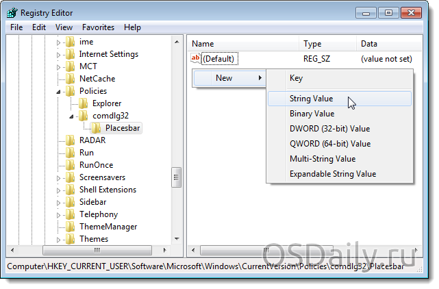 Виберіть розділ Placesbar і клацніть правою кнопкою миші по правій панелі. У контекстному меню виберіть команду Створити (New) -> Рядковий параметр (String Value).