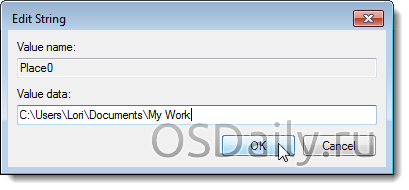 У полі Value data) діалогу зміни строкового параметра (Edit String, введіть повний шлях до теки, яку ви б хотіли бачити на панелі місць. Після введення натисніть Ok.