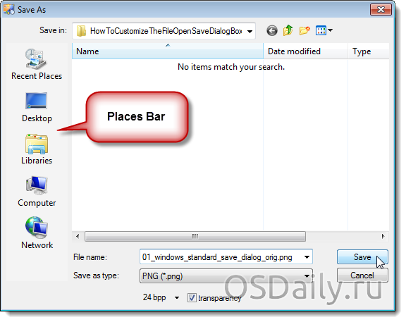 У свою чергу панель місць (Places Bar) розташовується на лівій стороні діалогу відкриття/збереження файлу і містить у собі кнопки доступу до часто використовуваних папок. За замовчуванням кнопки на панелі місць є посиланнями на Недавні місця, Робочий стіл, Бібліотеки, Комп’ютер і Мережу. Але ви можете замінити загальні елементи панелі місць на посилання на бажані собою папки.