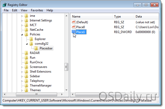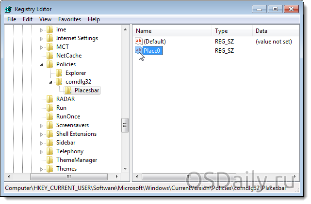 HKEY_CURRENT_USER Software Microsoft Windows CurrentVersion Policies comdlg32 Placesbar