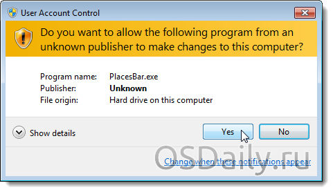 Якщо ідея ручного редагування реєстру вам не подобається, то ви можете кастомизировать панель місць за допомогою безкоштовної утиліти PlacesBar Editor http://melloware.com/download/ . Скачайте її і встановіть, слідуючи інструкціям. Якщо при установці ви побачите діалог контролю облікових записів, то клікніть Так (Yes).