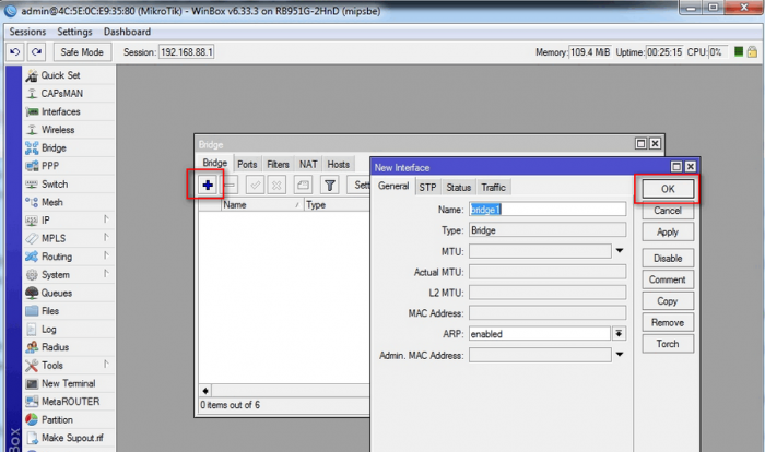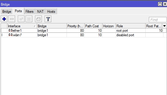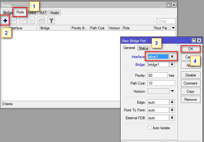 – Додаємо порти до створеного тільки що «мосту». Для цього переходимо в «Ports», вікна «Bridge», де додаємо поступово порти від ether1 до ether 4 до bridge1.
