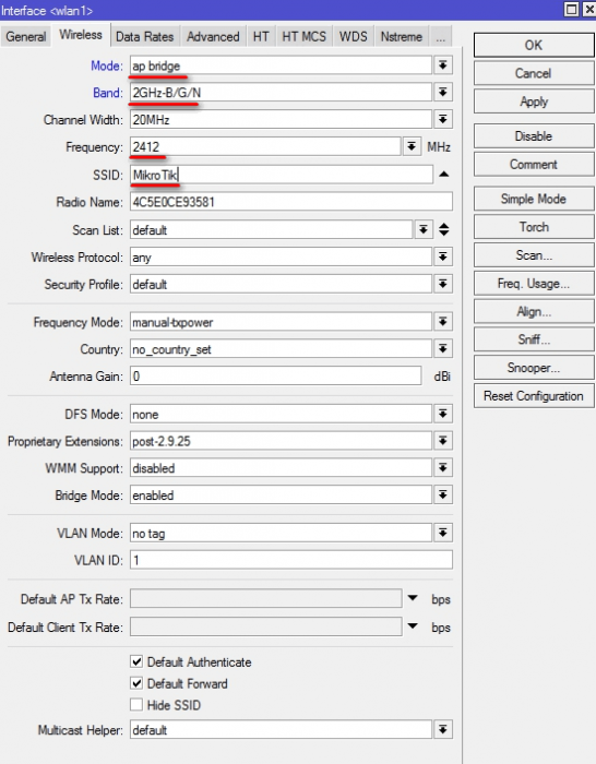 3. Після активації і збереження профілю, переходимо знову в розділ «Interfaces», де двічі клацаємо ЛКМ на wlan1, і переходимо в інші налаштування з’єднання. Тут доведеться змінювати лише частина даних. Всі виділені поля повинні бути заповнені так само як і на картинці.