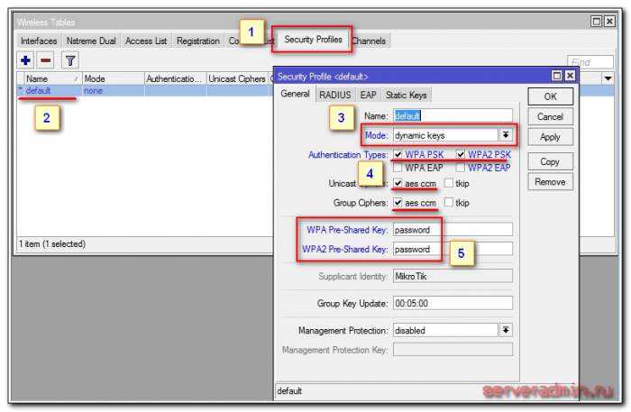 2. Тут же, в розділі «Security Profiles» потрібно буде налаштувати свій профіль. Тиснемо на «default» налаштувань, у вікні, під номером 3, потрібно активувати всі підкреслені на картинці чекбокси, а в параметрі Mode потрібно вибрати «Dynamic keys». Для установки пароля майбутнього бездротового з’єднання впишіть його в поля WPA/WPA2.