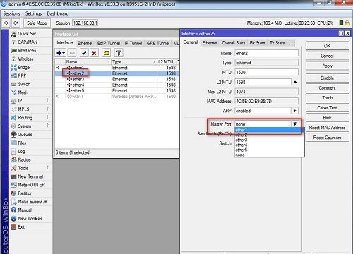 – Визначте майстер-порт. Припустимо це порт 1. Переходимо в «Interfaces», далі робимо подвійний клік по порту «ethe2» і в параметрі «Master Port» вибираємо його значення «ether1».