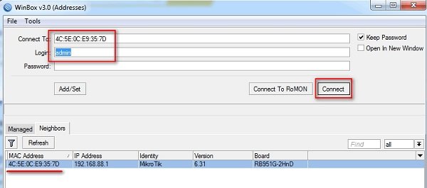 1. Встановлюємо утиліту WinBox. Запускаємо її і переходимо в спеціальний розділ «Neigbors», де відобразитися роутер підключений. Скопіюйте MAC-адресу роутера в спеціальне поле «Connect to». У полі «Login» вказуємо будь логін, а підлога «Password» не чіпаємо і переходимо далі.