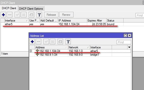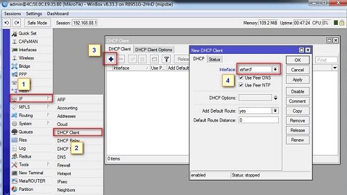 Для першого випадку достатньо буде перейти в спеціальний розділ «IP», де вибрати функцію «DCHP Client». Як підсумок – відкриється вікно. Вибираємо поле «Interface» і вибираємо порт підключення до інтернету, в нашому випадку – це ether5.